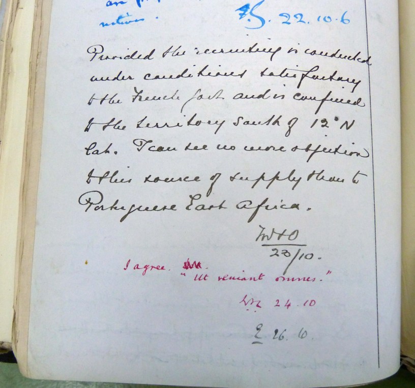 It is dated 8th October 1906 and I am reproducing it below. It asks whether there would be any objection for the Witwatersrand Native Labour Association (Wenela) to recruit labour for the South African gold mines from ‘French Somaliland’ – or Djibouti. It would appear that this would have broken the “Labour Importation Ordinance” which appears to prevent the recruitment of labour North of latitude 22 degrees. But I know nothing about this, although I know the mines did recruit a long way from the Witwatersrand. The South Africans were looking for 1,000 men. The reply from the Colonial office is below.