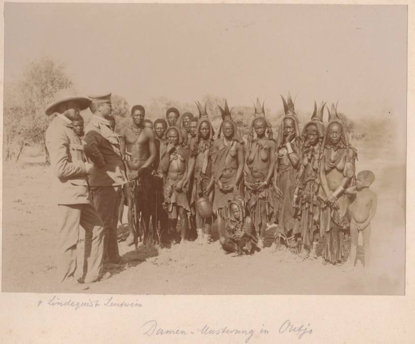 It shows him (second from the left) meeting with a group of Herero women at Outjo. Leutwein founded the town in 1897 as a military base.