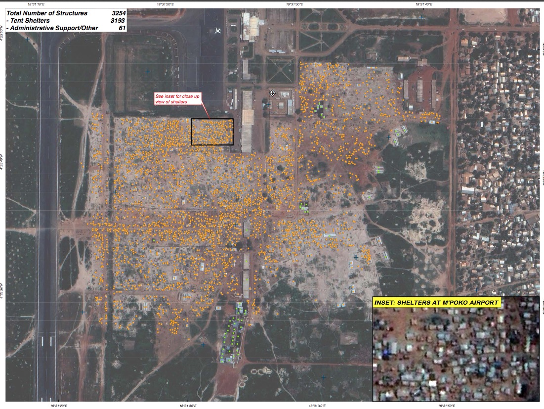 The United Nations satellite agency, UNITAR, has published the image below, showing the number of tents and other structures in Bangui’s M’Poko airport. UNITAR says the photograph shows the following: