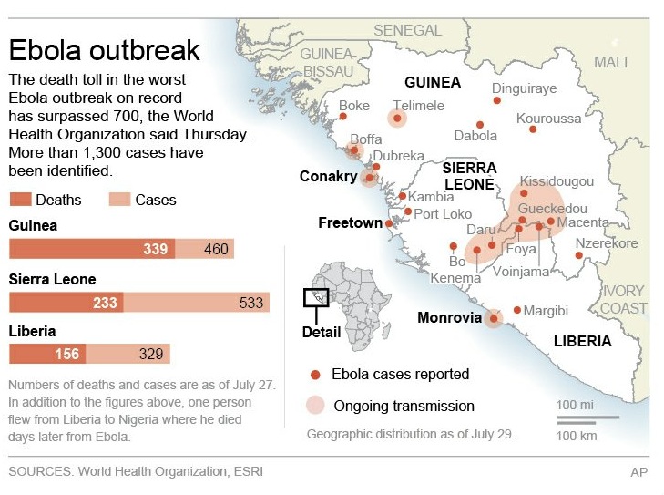 - Hundreds of troops deployed in Sierra Leone and Liberia to try to halt the disease. West African leaders agreed to seal off areas of infection, with troops, if need be. “We have agreed to take important and extraordinary actions at the inter-country level to focus on cross-border regions that have more than 70 percent of the epidemic,” said Hadja Saran Darab, the secretary-general of the Mano River Union bloc grouping the nations.