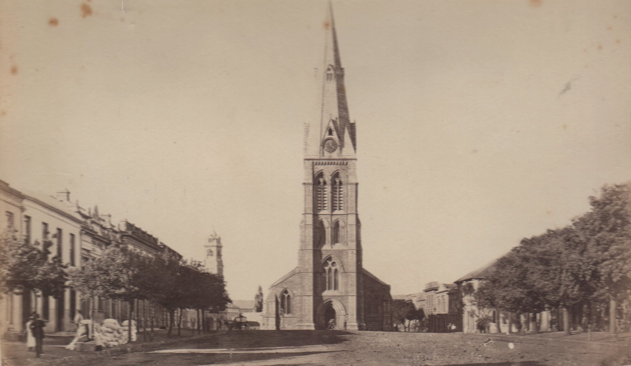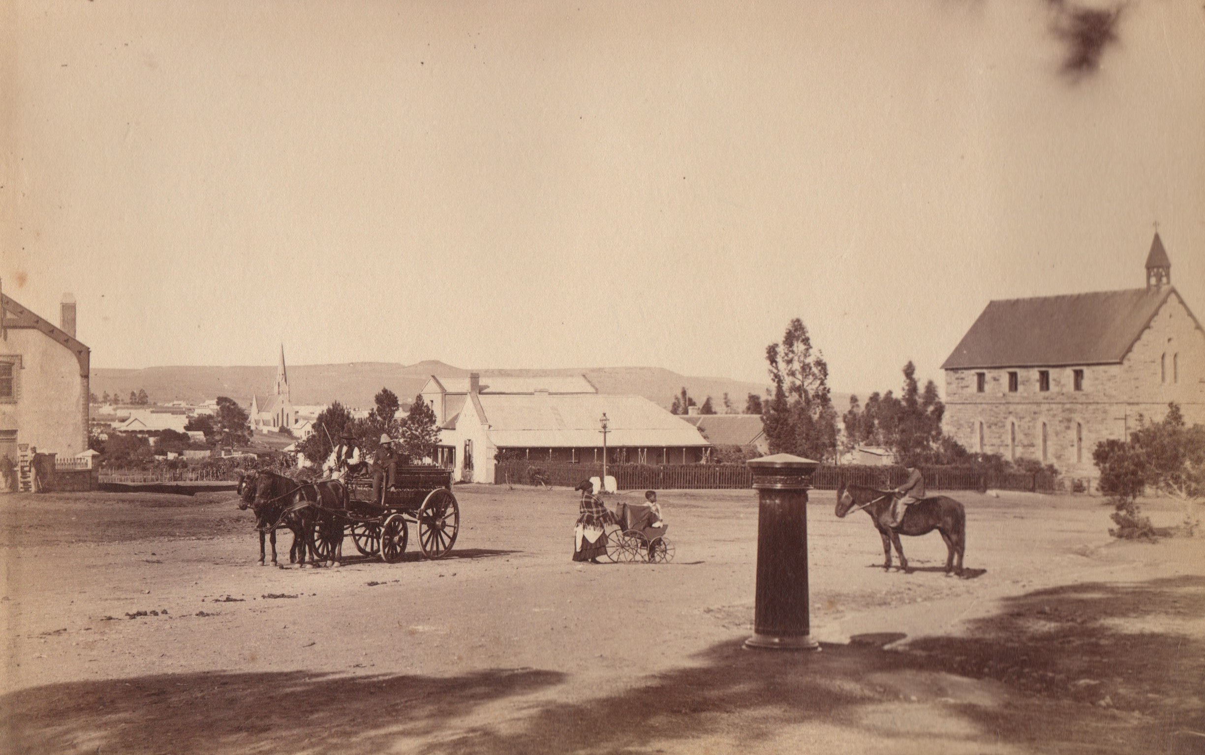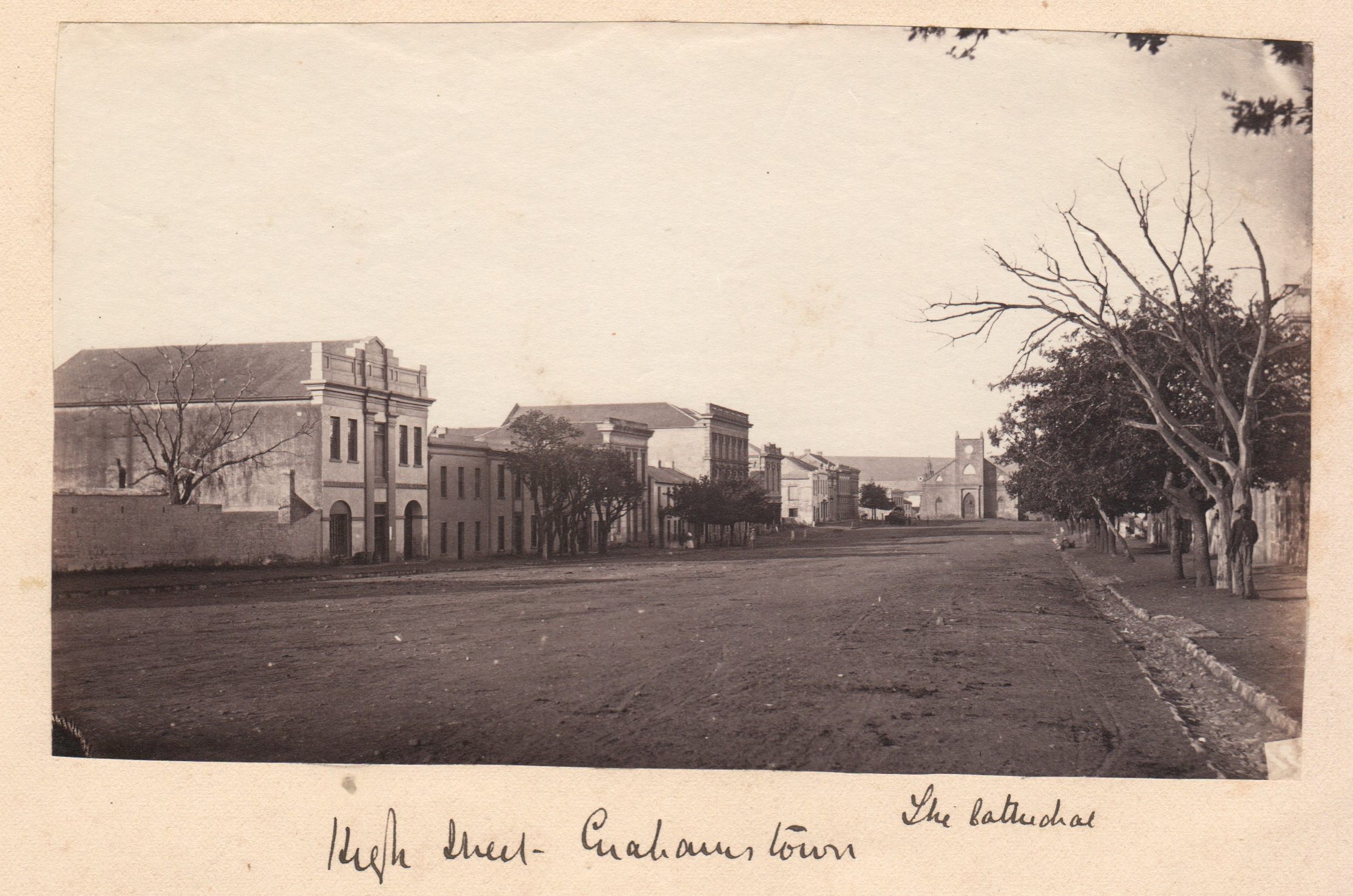 Thomas Baines visited the town in March 1848 and reported that: “… we entered the town by New Street which seemed, by far, more prolific of canteens and … retail stores, than of private dwellings … (Graham’s Town) contained at the time of my arrival a population of six thousand persons, of whom one-fourth were coloured, and houses to the number of seven hundred and fifty. Its principal streets cross each other at right angles, and at their point of intersection is placed the English Church, a plain Gothic building…”