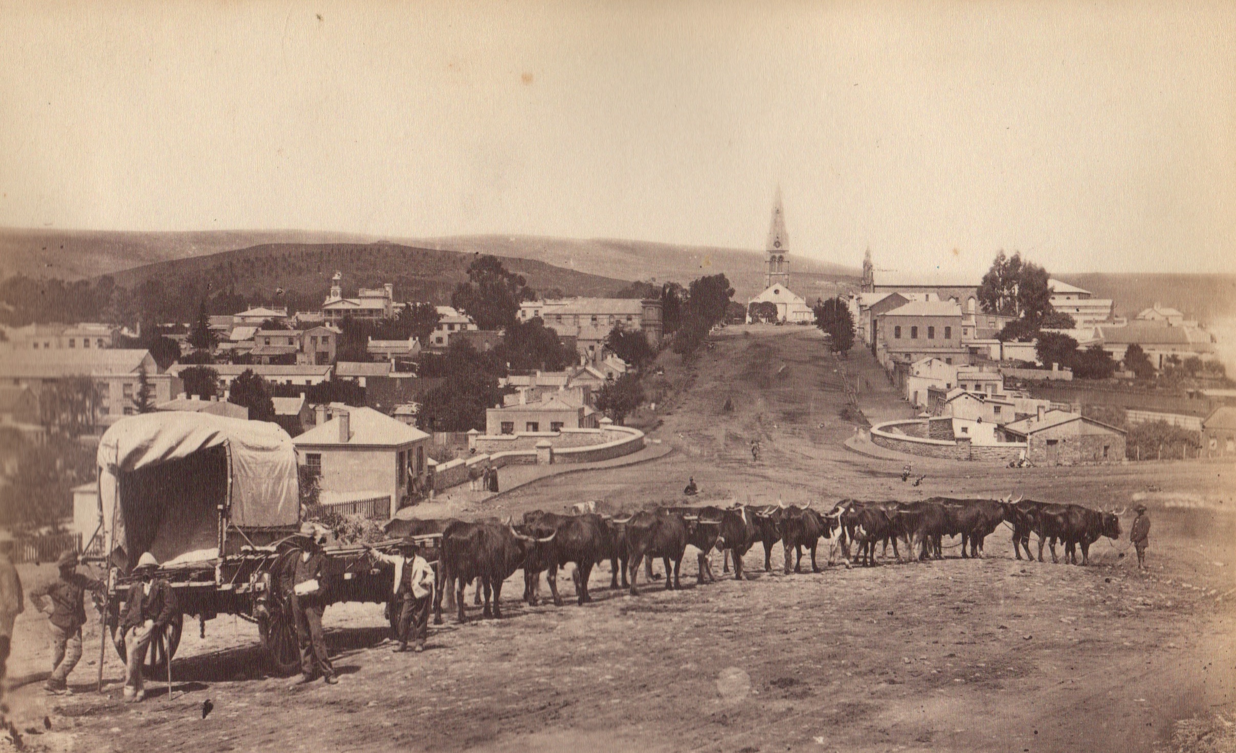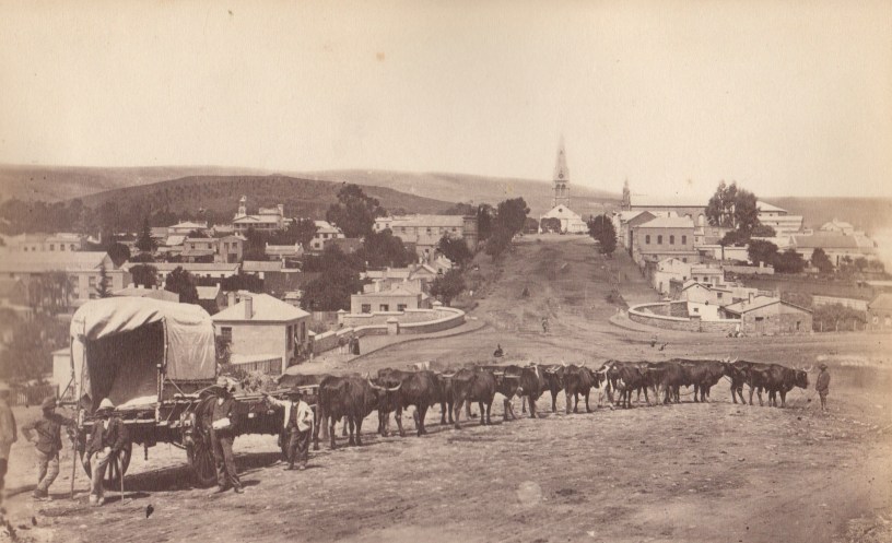 “On approaching Grahams Town, we were struck with the uninviting appearance of its site, which is in a naked country, at the foot of a low, rocky, sandstone ridge … The present town consists of a few streets, one of which is spacious, and serves as a market-place.