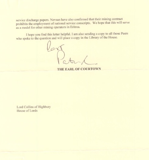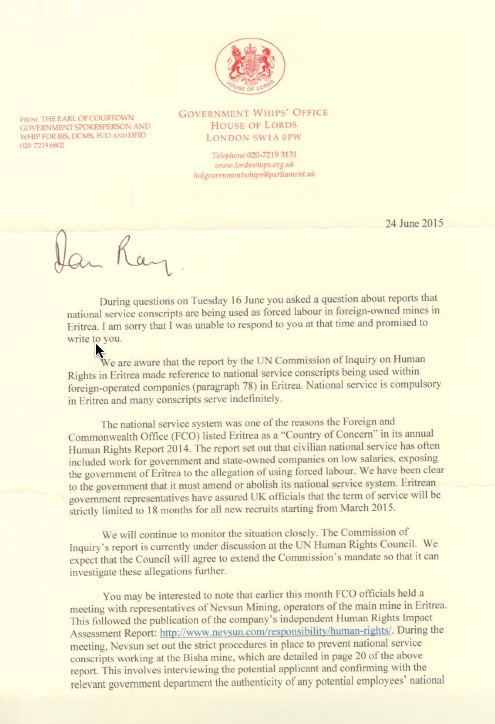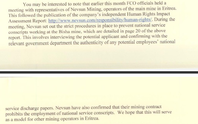 This issue was taken up by the UK Foreign and Commonweath Office during a meeting earlier this month, it has been revealed (see below). Nevsun assured the British that it has put in place safeguards to prevent this happening. I have highlighted the key paragraph before including the rest of the letter.