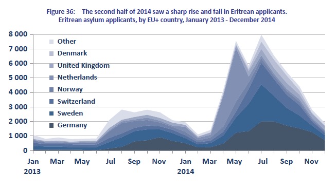 Eritrean asylum trendsThe sharp increase in the flow of Eritrean applicants in the first half of 2014, and the decrease thereafter, seems to be primarily related to the dynamics of travel routes and asylum policy in Europe, rather than changes in the situation within Eritrea, although the available information is inconclusive.
