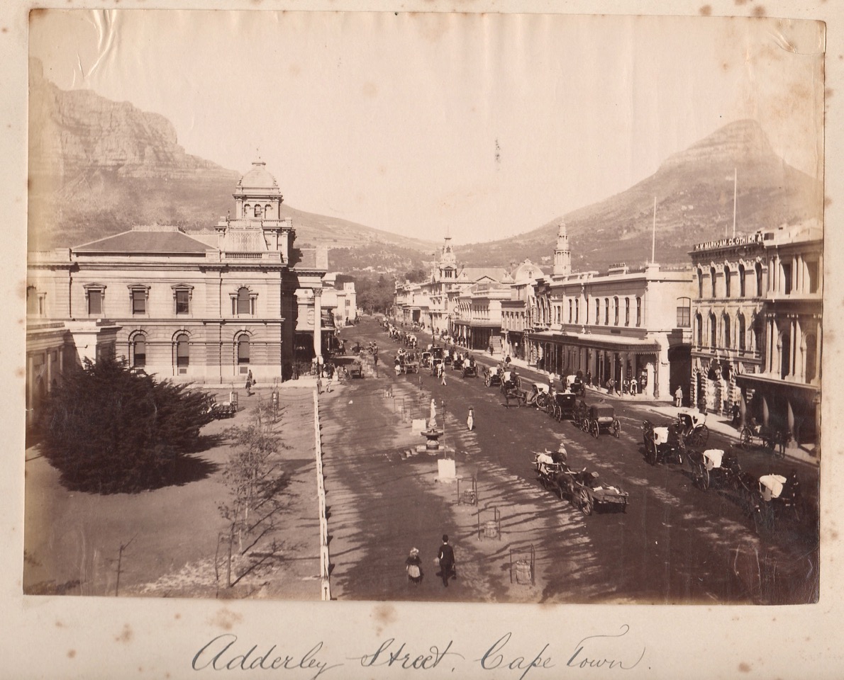 Adderley Street – once the grandest street in Africa – yet here unpaved and with an ox cart lumbering up it! I think the Standard Bank is on the left.
