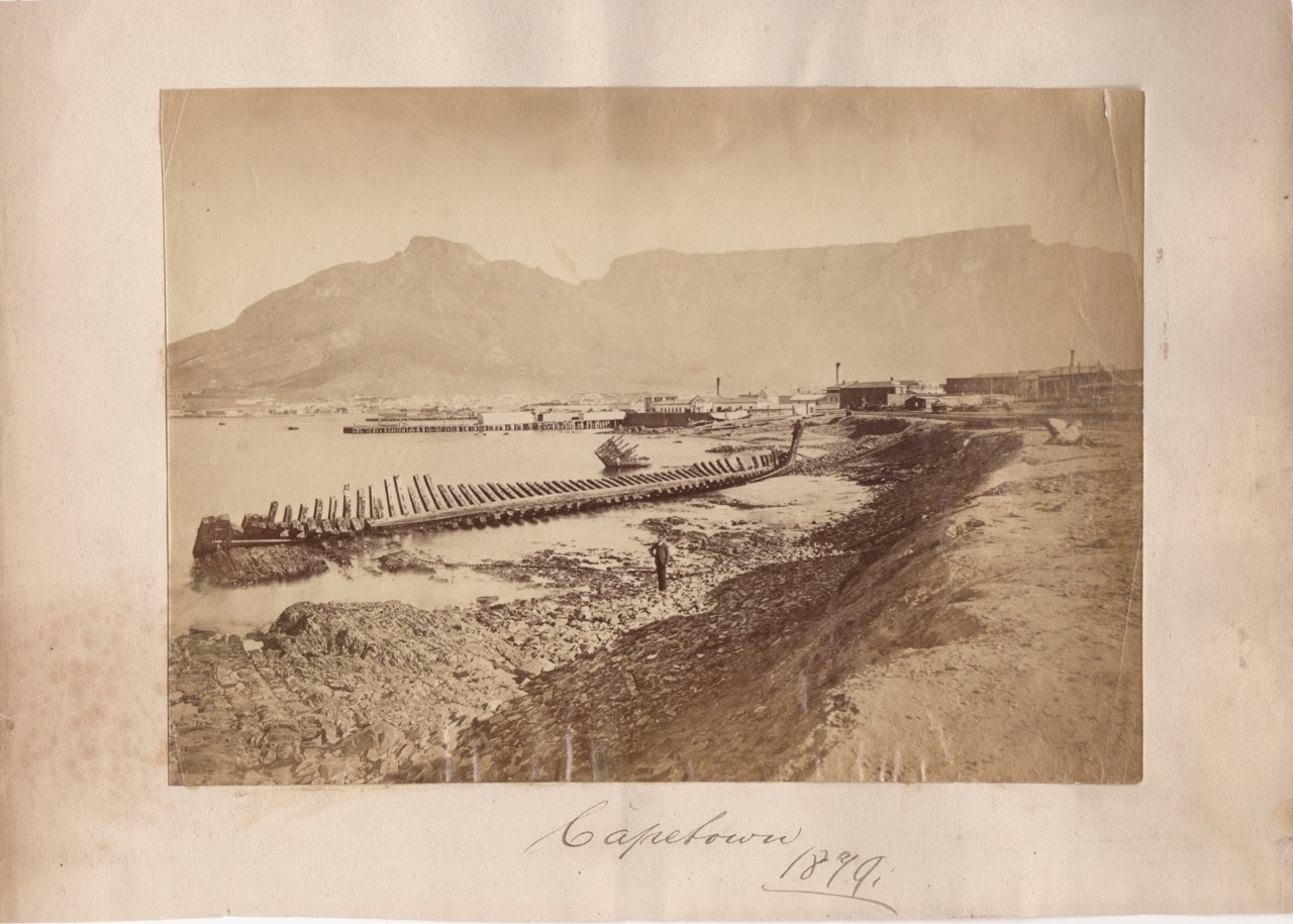 This shows Cape Town harbour in 1879, with the skeleton of a boat in the foreground.