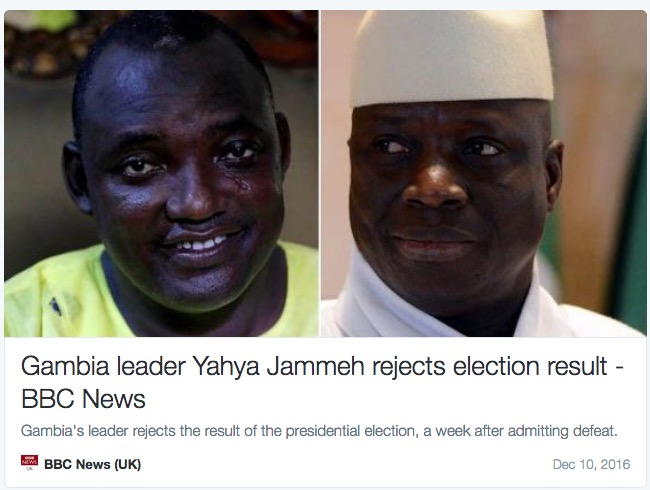 “Senegal’s foreign ministry, the United Nations Security Council, West Africa’s regional bloc and Gambia’s diaspora community have all urged Jammeh to respect the Gambian people’s choice.