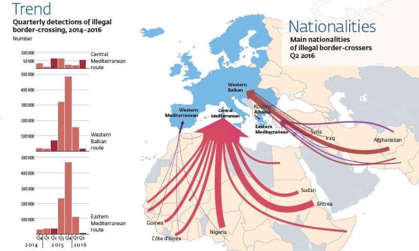 Consider the facts. These are the routes into southern Europe. (Map: Frontex Risk Analysis, Q2 2016)