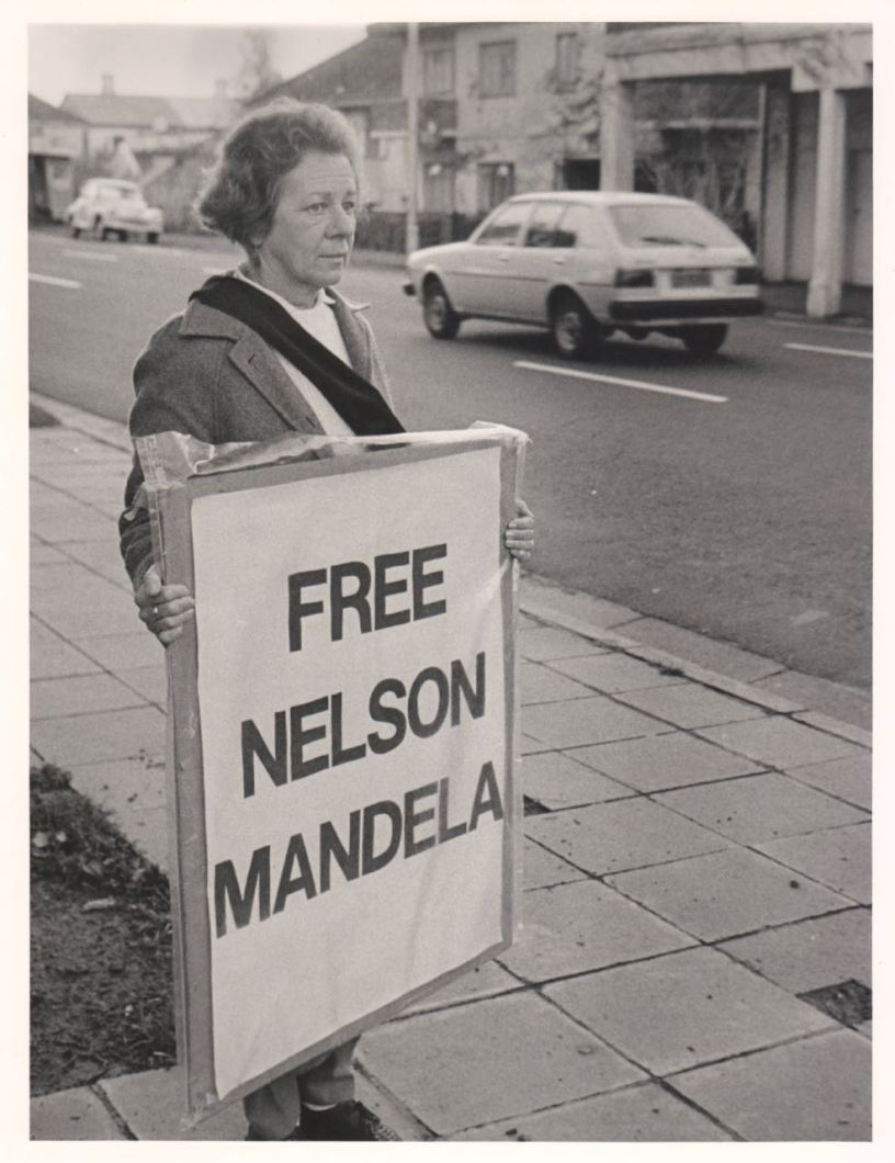 Thanks to friends, I now know who this woman is, standing in protest in the Cape Town suburb of Rondebosch on 18 August 1988.