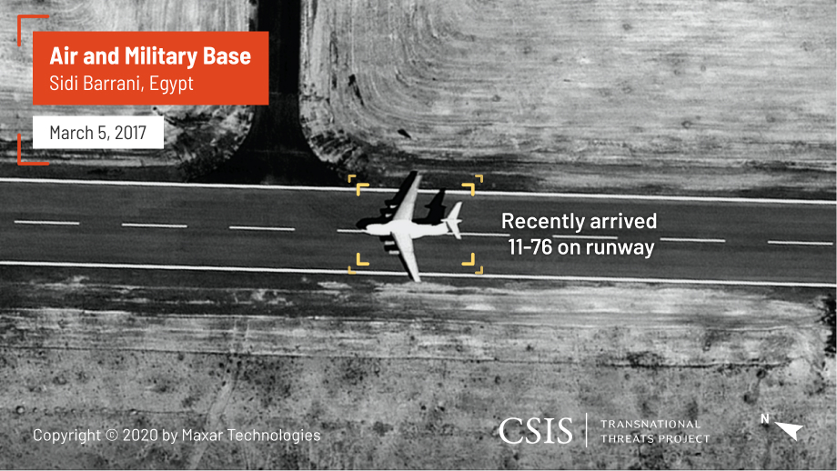 Left: A recently arrived Il-76 transport aircraft in March 2017 at Sidi Barrani. Russian special operations forces and private military contractors deployed to Sidi Barrani as part of a bid to support Libyan military commander Khalifa Haftar.