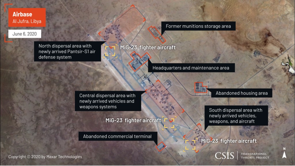 One of Russia’s primary deployment sites has been Al Jufra Air Base in central Libya, which has served as the launching pad for Wagner Group forces and Russian air support to the Tripoli campaign. A close examination of Russia’s deployment at Al Jufra Airbase reveals an expansion of Russian air and ground forces. In particular, satellite imagery shows a growth in the presence of the Russian PMC Wagner Group, a core component of Russia’s intervention in Libya.