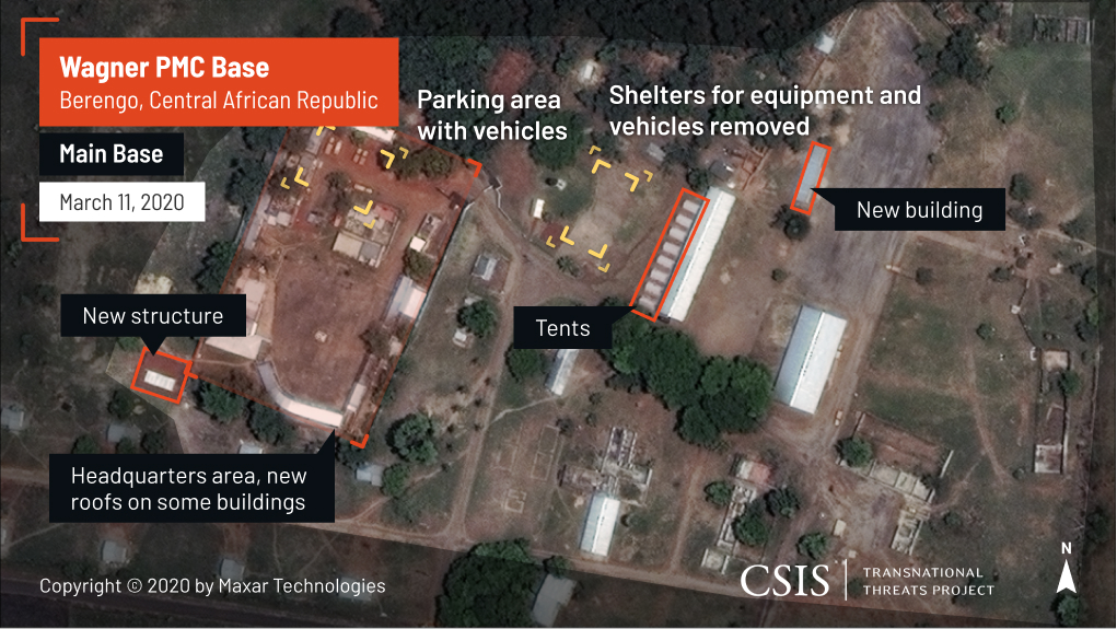 Russia has followed a similar model in the Central African Republic, where the Wagner Group and Patriot—another Russian PMC—have reportedly been active. Beginning in January 2018, Russia exchanged military training and security—primarily for President Faustin-Archange Touadéra and mining operations—for access to gold, uranium, and diamonds. New CSIS imagery sheds light on the training camp these troops established southwest of Bangui in the ruins of the Palace of Berengo.