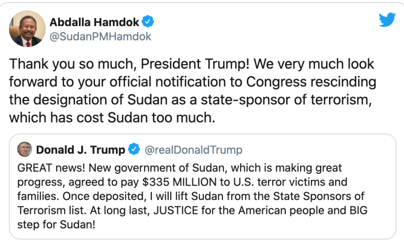 “GREAT news! New government of Sudan, which is making great progress, agreed to pay $335 MILLION to U.S. terror victims and families. Once deposited, I will lift Sudan from the State Sponsors of Terrorism list. At long last, JUSTICE for the American people and BIG step for Sudan!” Trump tweeted at around 8 pm Khartoum time.