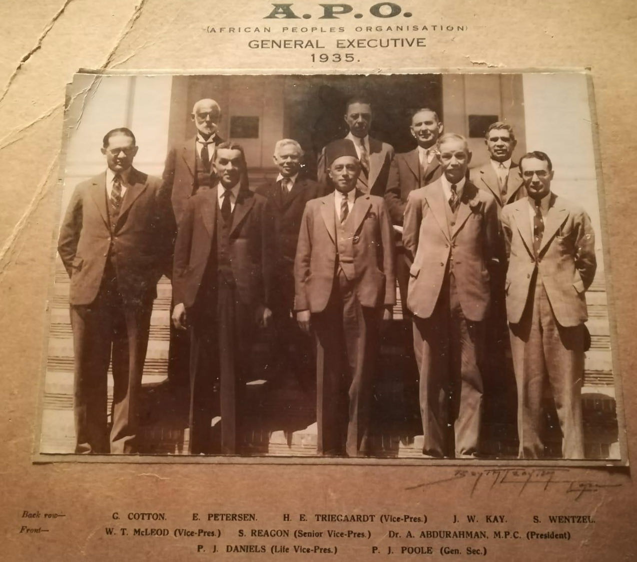 This photograph shows Dr Abdurahman at this period, with the party he led – the APO