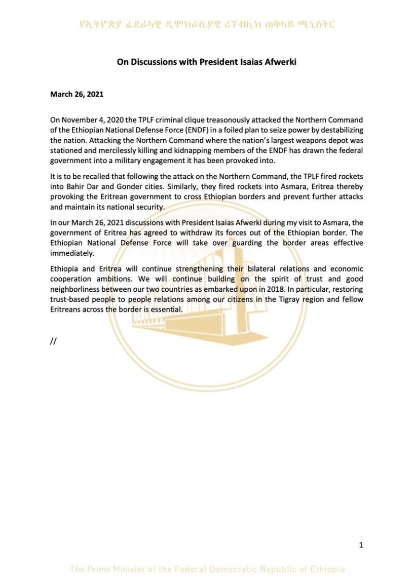 “The government of Eritrea has agreed to withdraw its forces out of the Ethiopian border,” Prime Minister Abiy Ahmed said in a statement on Friday. “The Ethiopian National Defense Force will take over guarding the border areas effective immediately.”