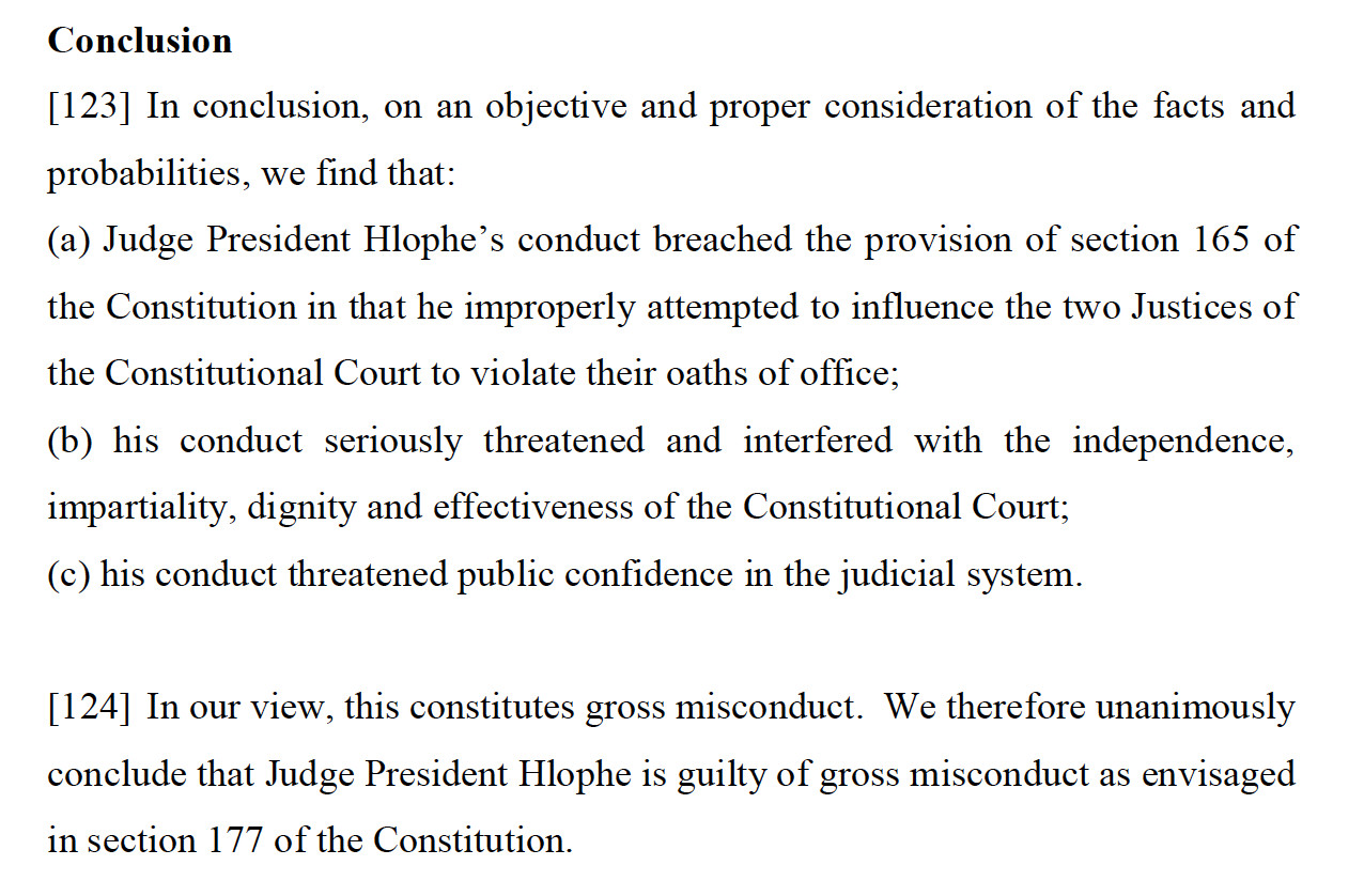 In the result, the Tribunal found that Judge Hlophe’s conduct breached the provision of Section 165 of the Constitution in that he improperly attempted to influence the two Justices of the Constitutional Court to violate their oaths of office; his conduct seriously threatened and interfered with the independence, impartiality, dignity and effectiveness of the Constitutional Court; and further his conduct threatened public confidence in the judicial system.