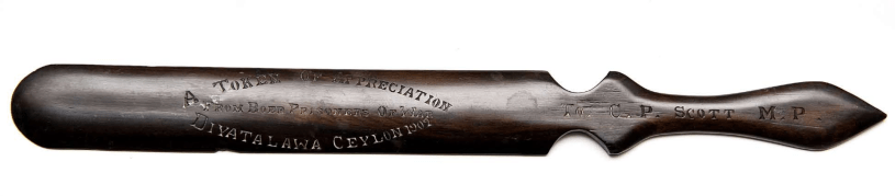 In 1902, to show their gratitude for his stand against the war, the Boers presented Scott with an ornamental wooden newspaper turner.