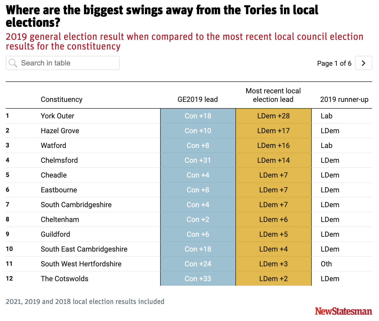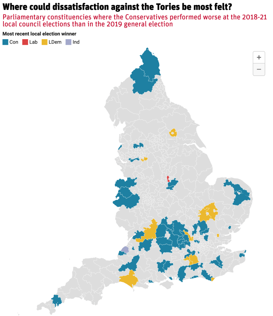 Mapped here are the Conservative-held constituencies that either experienced a shift away from the party or a net swing in the direction of one or more of the so-called progressive parties at one or more of the local elections held between 2018 and 2021. It shows how variable votes are by constituency and how willing voters are to entertain alternative parties.