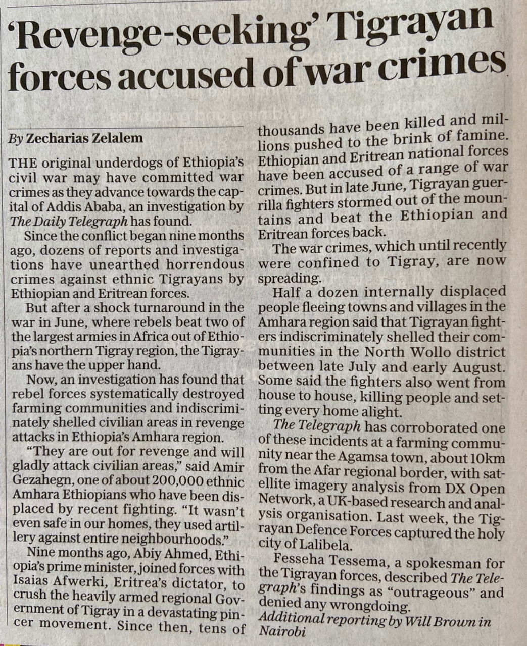 The second is a report from today’s Daily Telegraph which accuses the Tigrayan forces of committing atrocities.