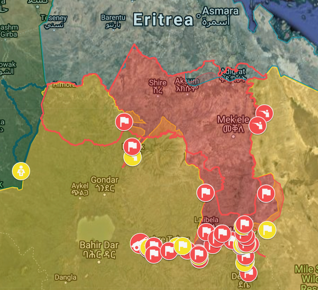 “Afar forces have recaptured the vast majority of Afar which was taken by the TDF earlier in the summer. Kelwan, close to Woldiya, was captured by Afari forces, putting them in a position to threaten the TDF supply line into Amhara.”