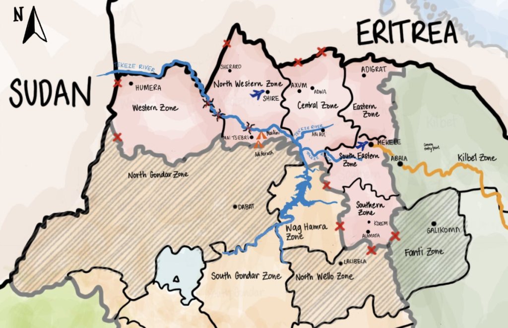 Large parts of western Tigray had long been claimed by their neighbours – the Amhara – and continued to be occupied by Amhara, Eritrean and Ethiopian troops, who were determined to prevent Tigray from establishing a route to Sudan, through which they could receive aid and other supplies.