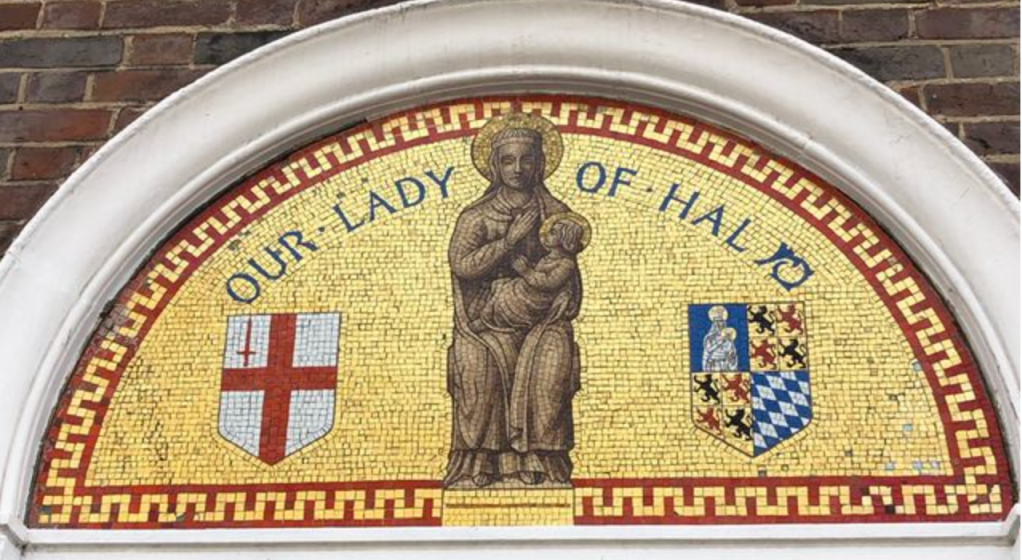 The Arlington Road entrance doesn’t immediately catch the eye, though there’s a charming mosaic as well as inscriptions which explain the Belgian connection. A small side chapel, the Hal chapel – usually open for an hour or so after midday mass – has a likeness of Our Lady in dark wood, a replica of the venerated medieval statue at the shrine outside Brussels.