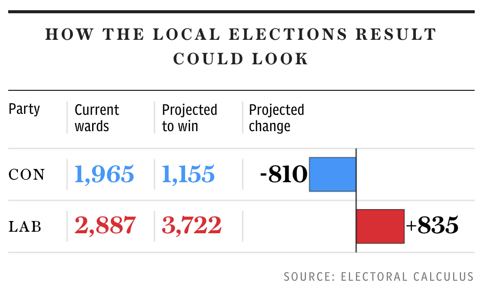 The Conservatives are on course to lose more than 800 council seats in next month’s local elections in results that, if repeated at the next general election, would see Sir Keir Starmer, the Labour leader, become prime minister.