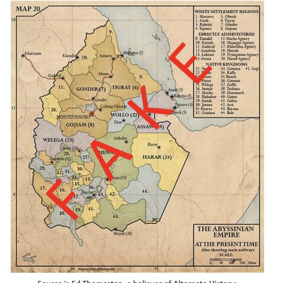 In the replies, not only maps are being posted out of context; there are also fake maps popping up. I just discovered one, that you may have seen already. This map is often posted on social media as evidence that the Gonder-Tigray border has been on Tekeze since the time of the Abyssinian empire. The map shows numerous flaws. See non-existent “white settlement regions”, “Montevenoso”, “Colonia Vittoria”, railways and encroachment onto Sudan and Djibouti. The map is fake; it was created in 2009.