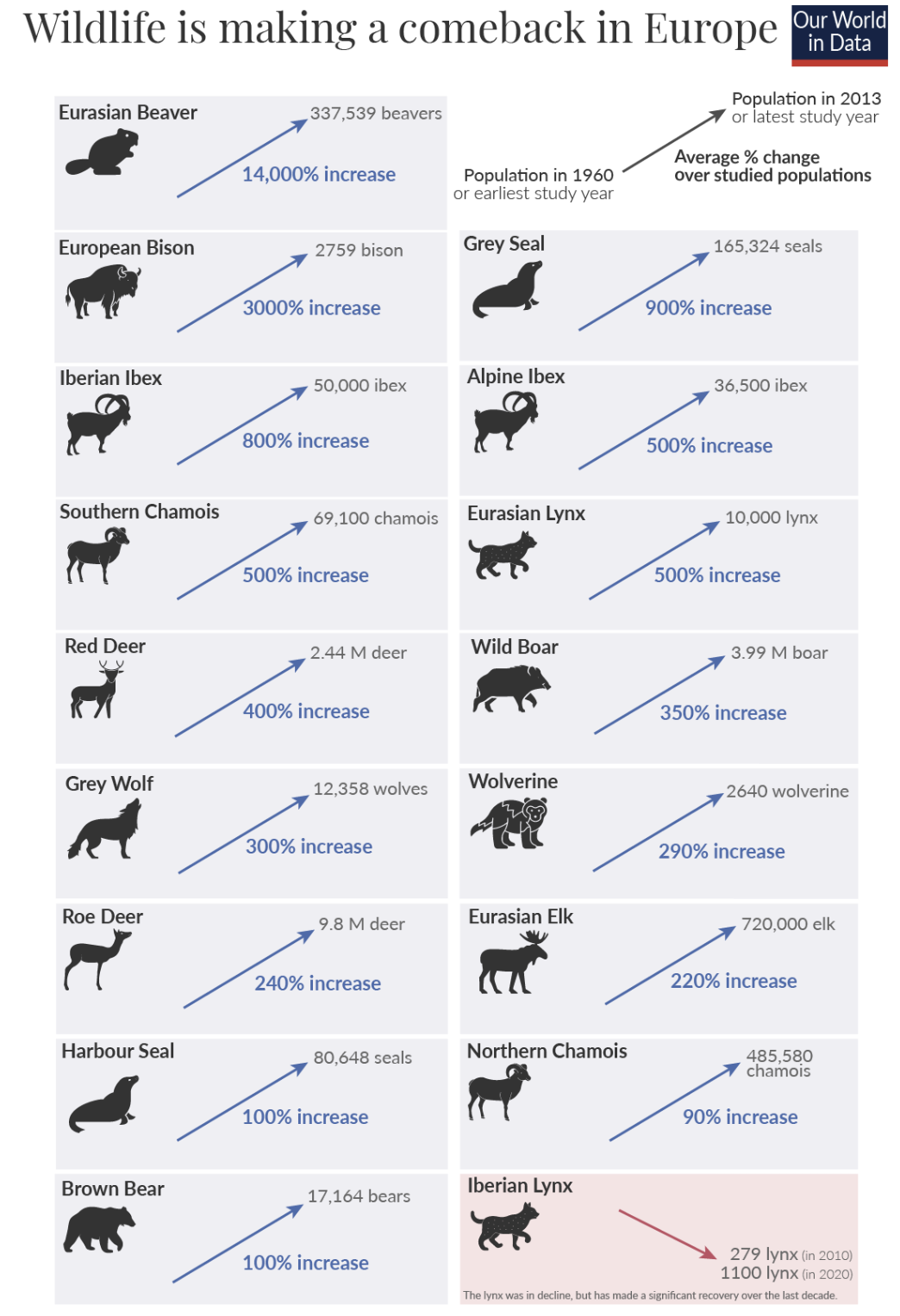 The Eurasian beaver has made the most remarkable recovery. It’s estimated to have increased by 140-fold, on average. There were likely only a few thousand beavers left in Europe in first half of the 20th century.4 Today there are more than 330,000. This study only included data for studied countries in Europe. When we take Eurasia as a whole, it is estimated that there are well over one million beavers.