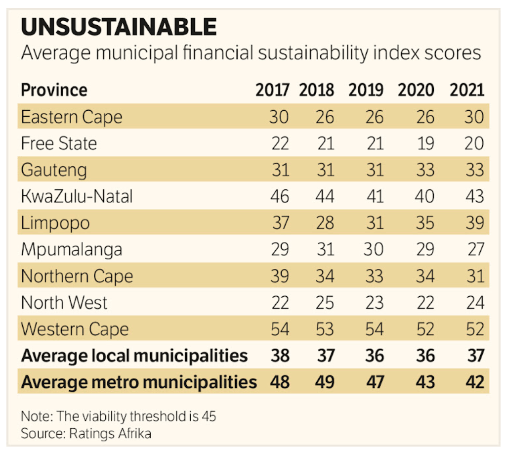 The municipal sector faces financial collapse, except in the Western Cape, where nearly all the top-scoring municipalities are situated