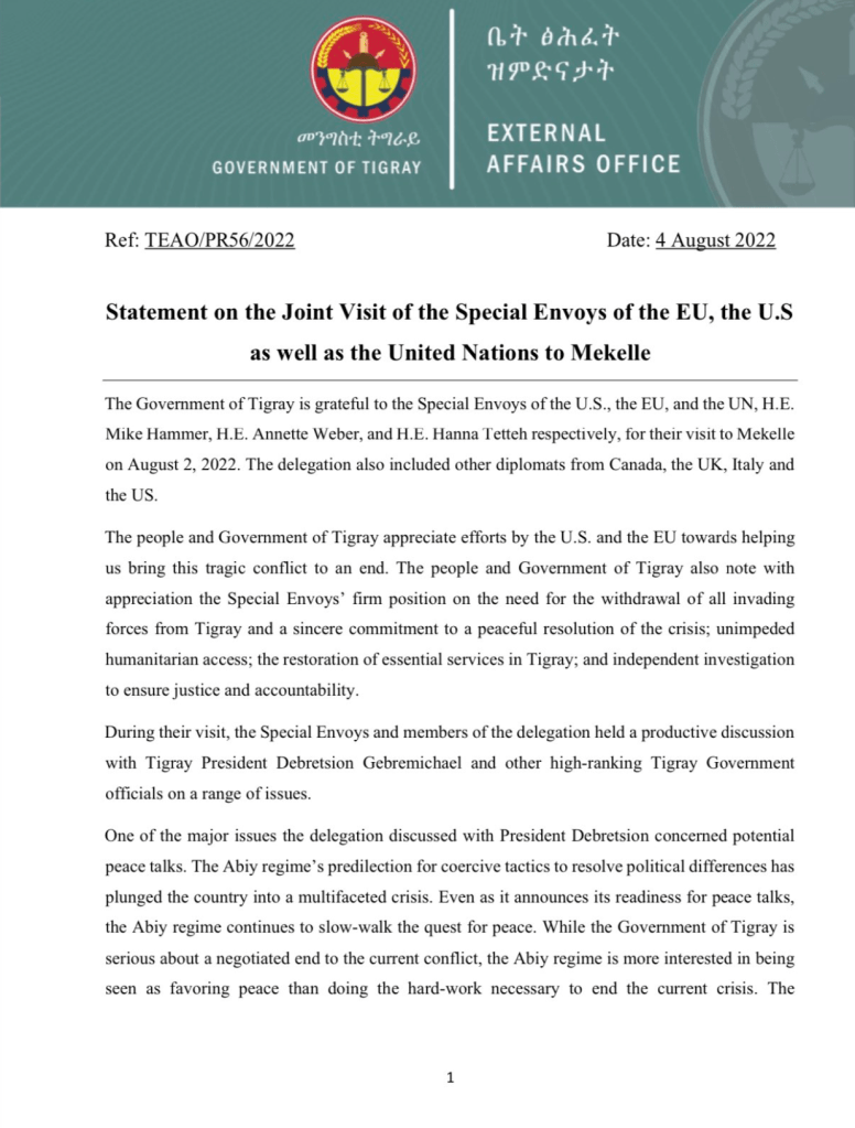 The government’s complaint came in the backdrop of a meeting held on 02 August between Debretsion Gebremichael (PhD), President of Tigray regional states and U.S. Special Envoy to the Horn of Africa Mike Hammer, European Union Special Representative for the Horn of Africa Annette Weber, UN Under Secretary General & Special Envoy to the Horn of Africa Hanna Tetteh as well as Ambassadors of Canada, Italy, and the Deputy Head of Mission of the U.K, which took place in Tigray’s capital city, Mekelle.