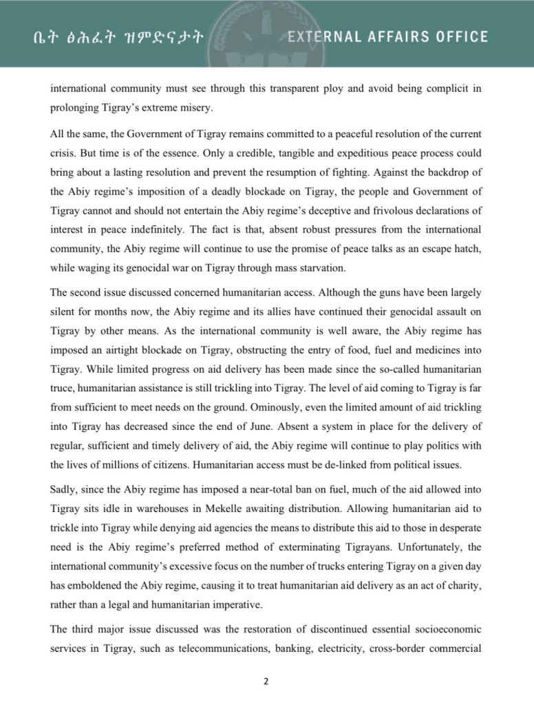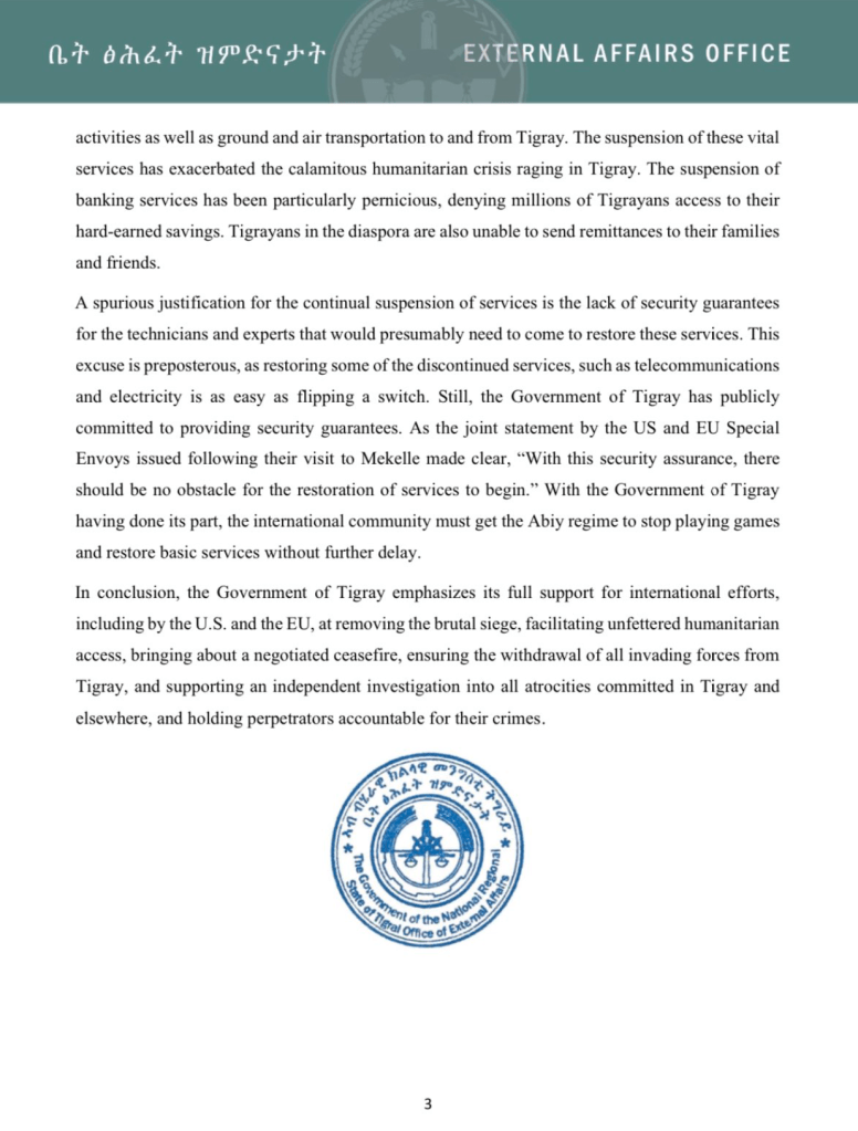 Ethiopia’s position on the resumption of basic services also dismisses Tigray’s repeatedly stated position on the non-negotiability of the resumption of basic services. The region’s President Debretsion has most recently told the local Tigray TV that Tigray wanted to end the war with peaceful resolution, but to hold peace talks certain preconditions must be met initially. Among others, “basic services must be restored,” he said