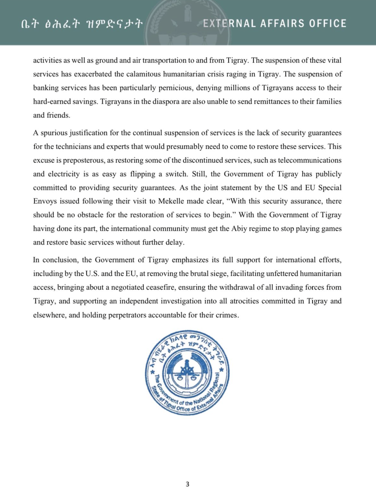 The Envoys agree that a swift restoration of electricity, telecom, banking, and other basic services in Tigray is essential for the people of Tigray, as recognized in earlier discussions with the Ethiopian Government. Tigray Regional President Debretsion provided the international community a letter to be passed to the Government of Ethiopia providing security guarantees for those who need to work to restore services. With this security assurance there should be no obstacle for the restoration of services to begin.
