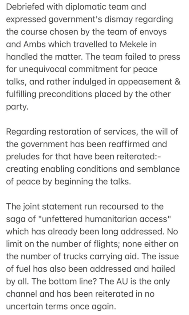 Addis Abeba – The Ethiopian government , through the Prime Minister’s National Security Adviser, Ambassador Redwan Hussain, expressed its dismay at the “course chosen by team of envoys & Ambassadors in handling the matter when in Mekelle.”