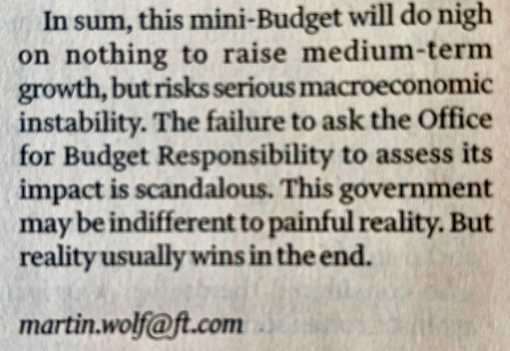 Don’t take my word: here are some reputable commentators. Let’s start with the best – Martin Wolf, senior economic writer for the Financial Times last Saturday, 25 September.