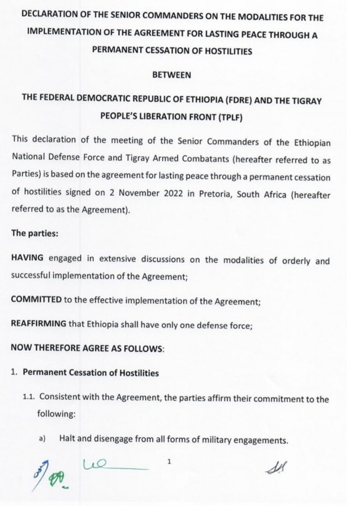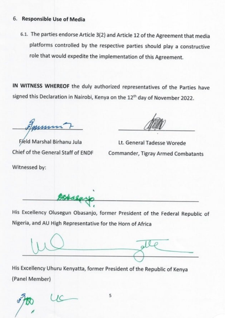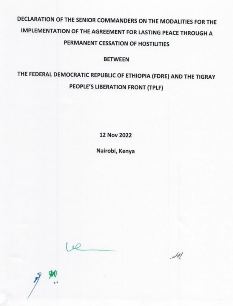 Uncategorized Full text of Modalities for Implementing the Cessation of Hostilities Agreement in Tigray, signed Nairobi 12 November 2022 Date: 14/11/2022Author: Martin Plaut 8 Comments Share this: Click to share on X (Opens in new window) X Click to share on Facebook (Opens in new window) Facebook Click to print (Opens in new window) Print Click to email a link to a friend (Opens in new window) Email Click to share on WhatsApp (Opens in new window) WhatsApp Like Loading... Related