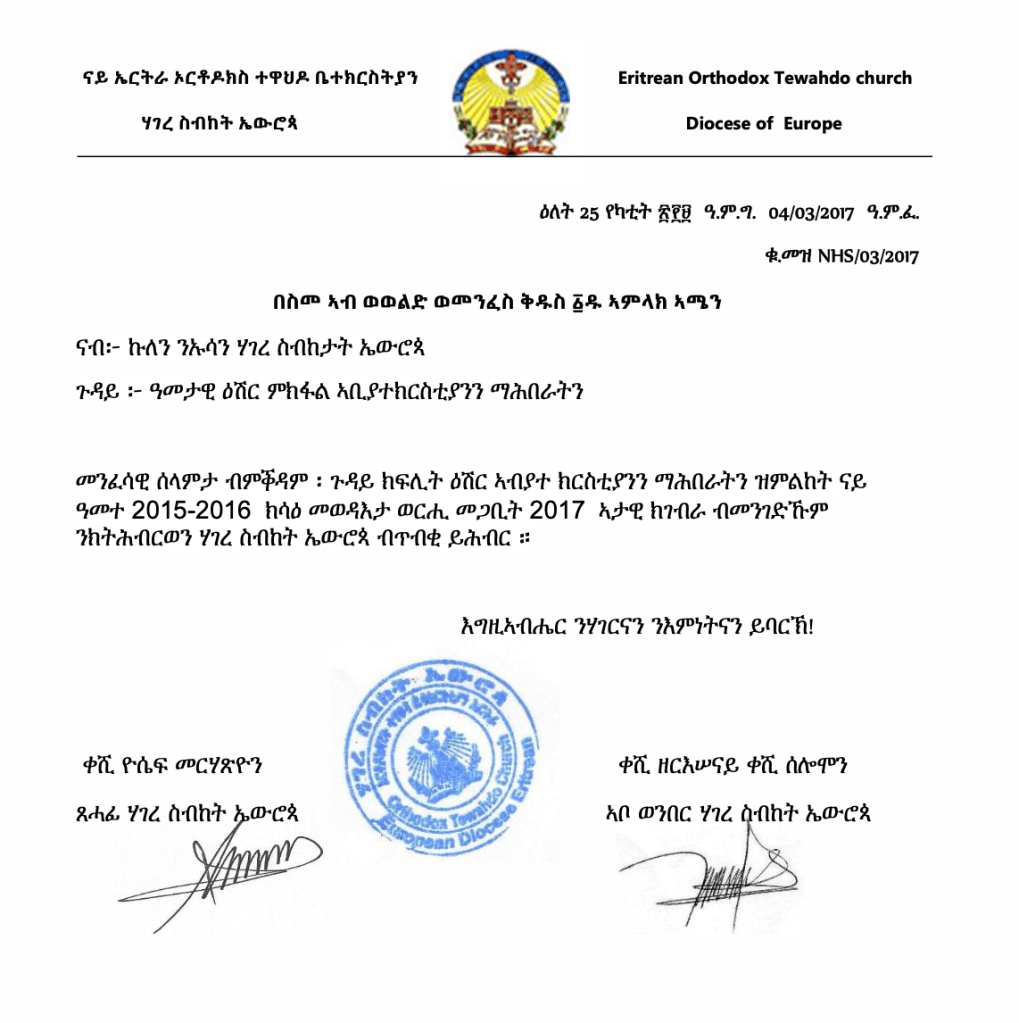 The Diocese of Europe gives you strict instructions to inform churches and associations to pay tithes for the years 2015-2016 by the end of March 2017.