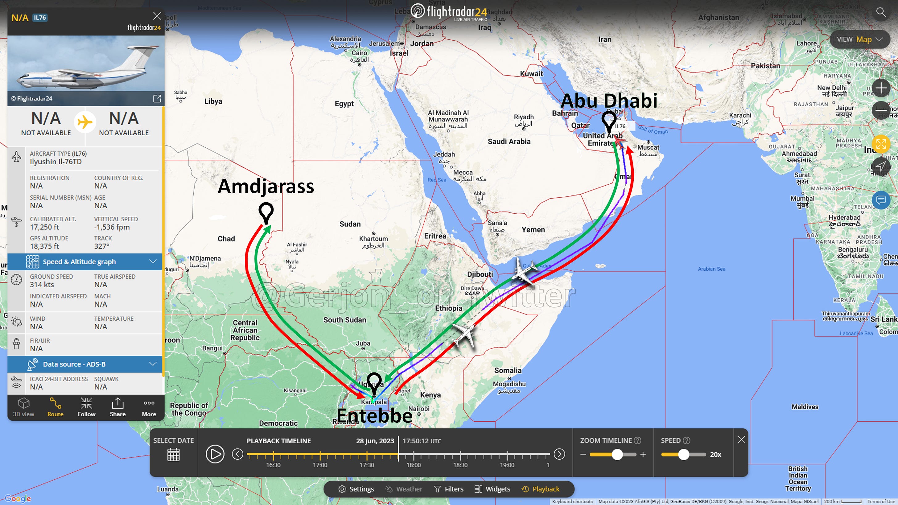 The destination of many of the recent flights from the military apron at Abu Dhabi International Airport is Amdjarass, a remote city in Northeastern Chad. The destination of earlier flights from the UAE via Entebbe remains unconfirmed.