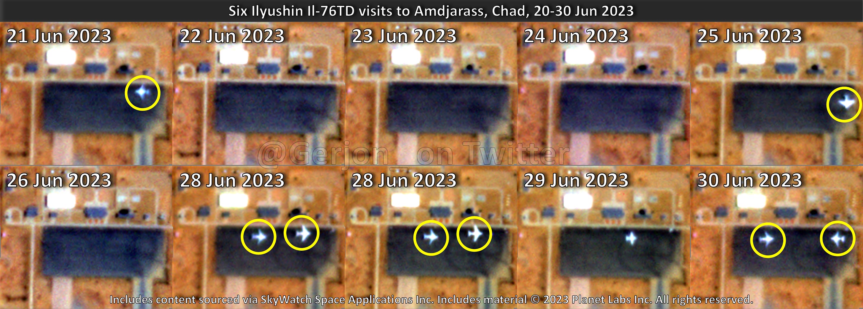In the weeks before 21 Jun 2023 (01 May 2023 – 20 Jun 2023), no Il-76s can be seen on satellite images of Amdjarass. These have therefore not been included in the above graphic.