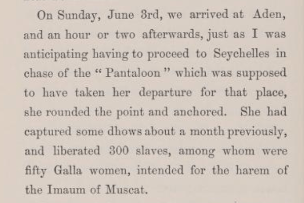 Challa Salfey, an Oromo (then referred to as ‘Galla’) originally from what is now southern Ethiopia, as a child of seven was rescued from a slave dhow in the Indian Ocean intercepted by the British warship ‘Pantaloon’.[1]
