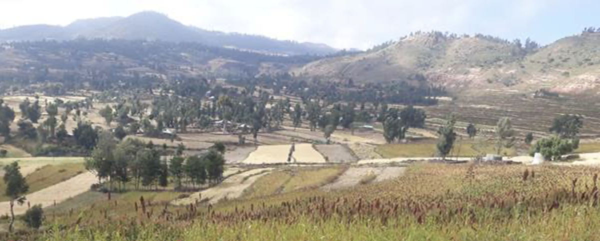 Croplands near Hagere Selam, by the end of October. The crop with reddish grains is sorghum; it performed very well because there were good spring rains, that provided sufficient soil moisture to pass the dry spells in the main kremti rainy season. The uniformly bright lands have been sown with the “new wheat” gifted by the Oromia region to the Tigray farmers; it performed well in these places because the soil is clayey, and fertilizer was used (though it was particularly expensive in 2023). In the mid-scene, soils are more sandy and stony, and (immature) crops had to be harvested early due to lack of soil moisture; there was hardly any rain in July.