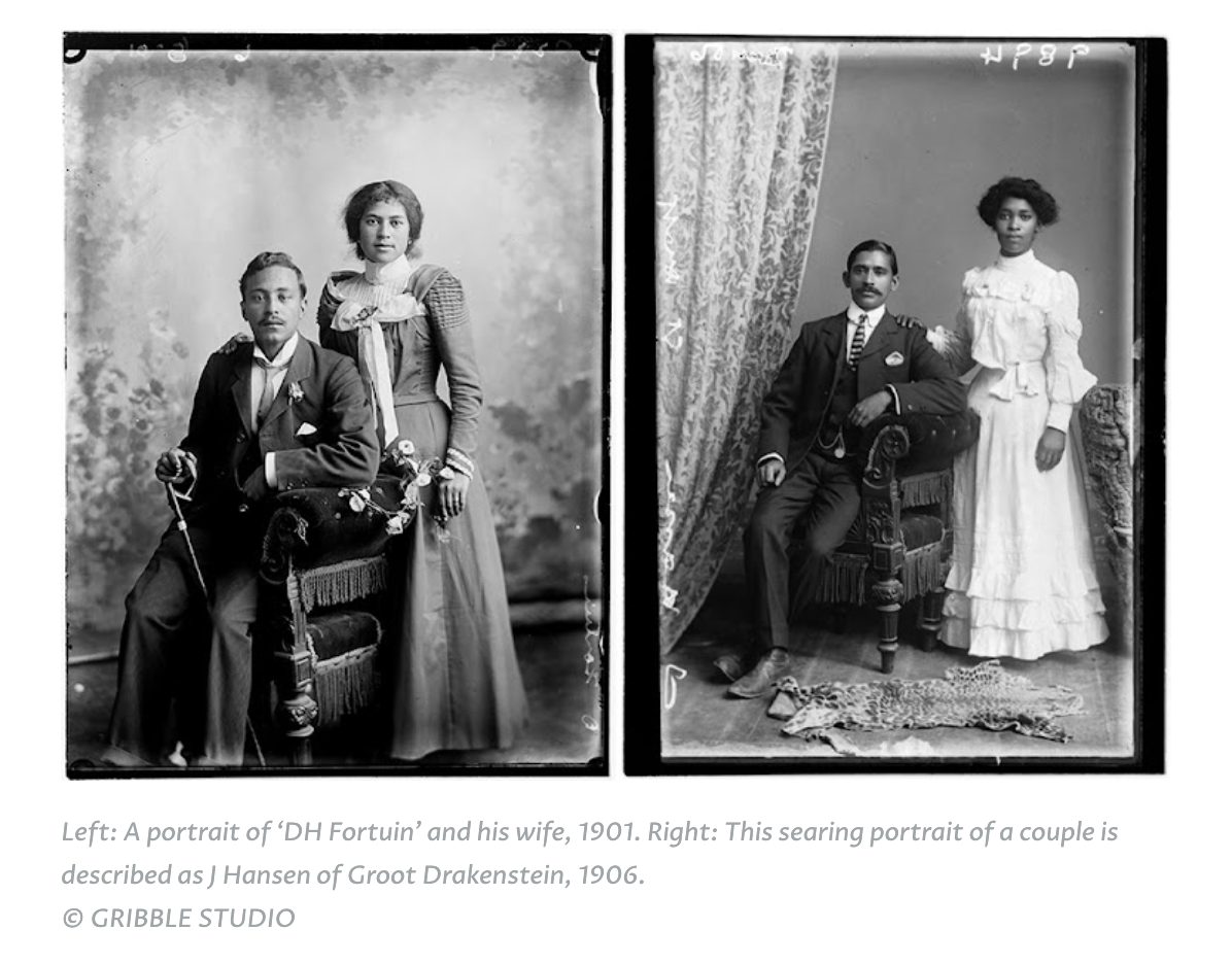 Left: A portrait of ‘DH Fortuin’ and his wife, 1901. Right: This searing portrait of a couple is described as J Hansen of Groot Drakenstein, 1906.