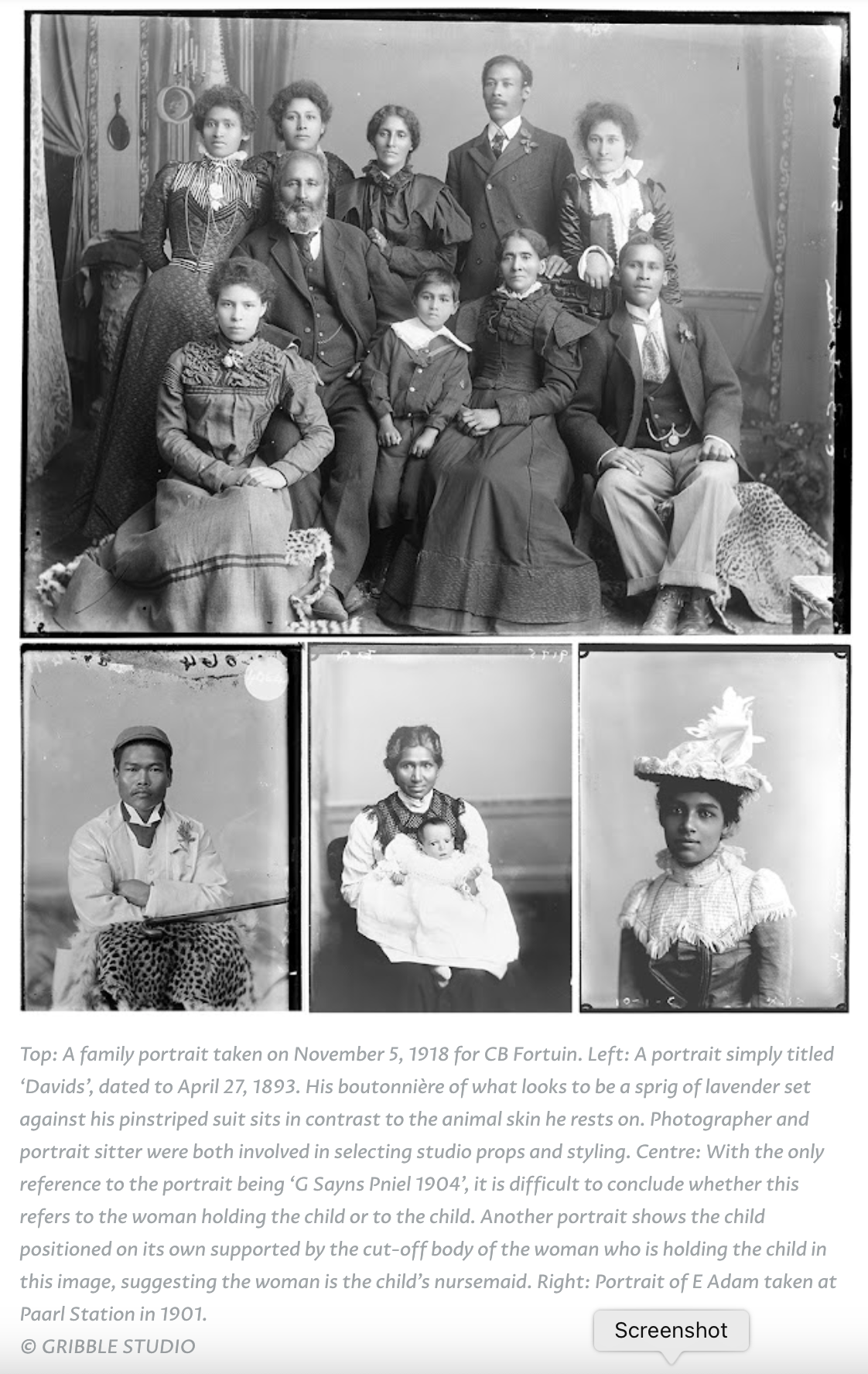 The politics of capture in relation to race are surprising in that they both uphold and reject our expectations about who is depicted in these 30,000 photographs. Most often, since the 1980s, the collection has been used by descendants of white familes, often Afrikaans, keen to explore their genealogical history and the buildings their ancestors lived in. However, the studio portraits also provide a social and visual record of the people of Paarl who have often not been part of the town’s official story. The surnames Abrahams, Africa, Allies, Arendse, Adams, Baantjie, Bahodien, Davids, Fortuin, Cupido, Ismael, Latief, Jacobs, Mahomed, Mathee and Solomon represent just a few of the families who have been in Paarl for generations and are part of the fabric of the town. More than that, they built it. Many of the glass plates have the names of the sitters scribbled on the side. Their stories remain untold unless we can match them to living descendants.