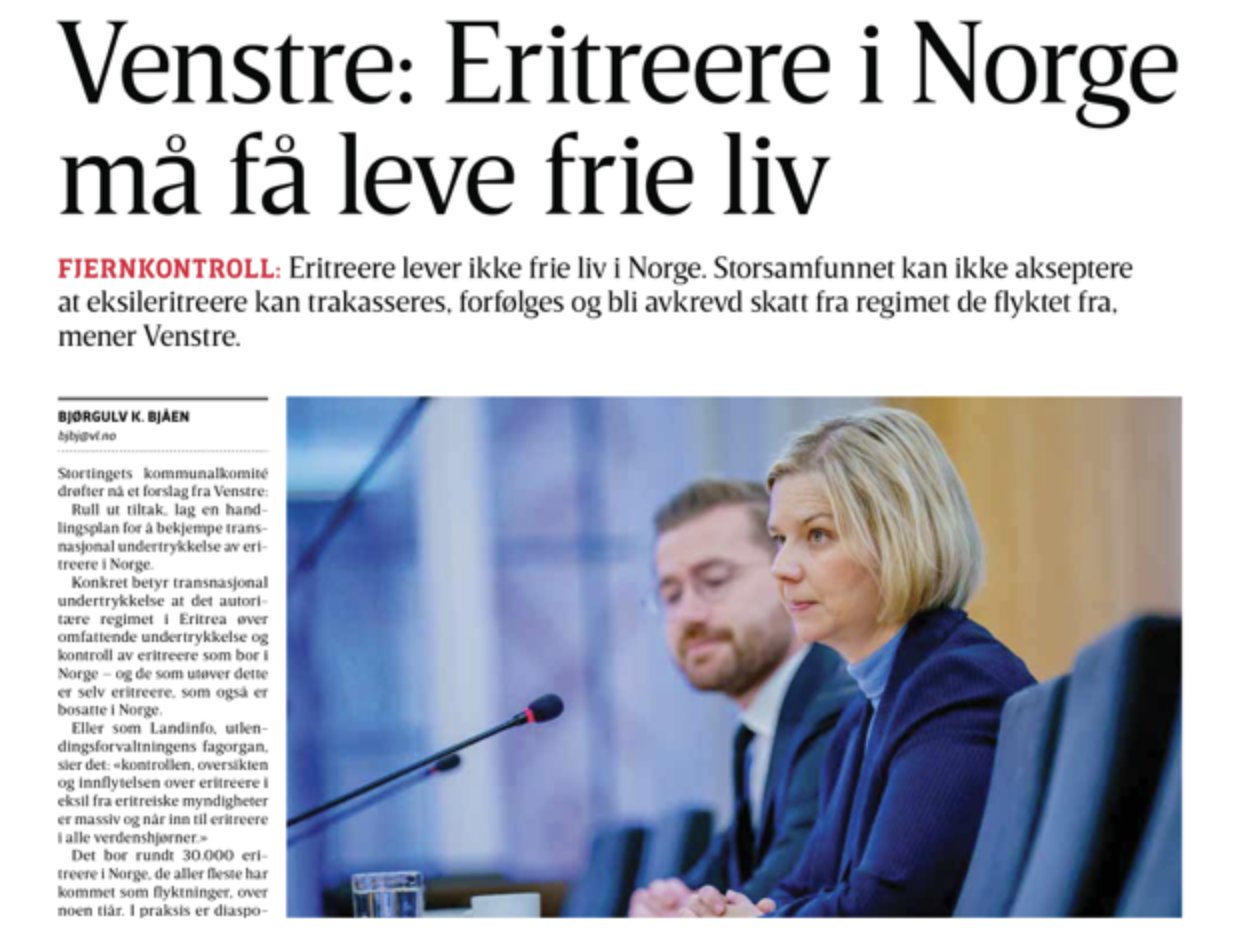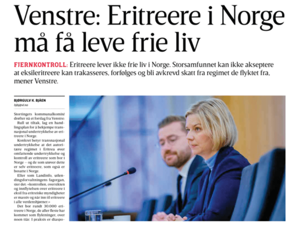 “Eritreans who are subjected to transnational oppression are deprived of the opportunity to live a free life in Norway, and thus lose full political and social rights. Norwegian society at large cannot accept that exiles can be harassed, persecuted and taxed from the regime they fled from,” write the five Storting representatives from the Liberal Party.