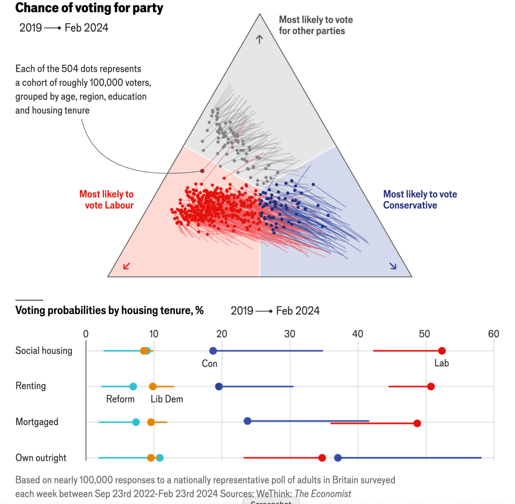 Our model shows that the hardest swing in Scotland from the snp and towards Labour is among less-educated people in cities. Labour is also doing very well among middle-aged Scots. Since 2019 the chance of a 35- to 44-year-old Scot voting for Labour has increased by more than half. Many Scottish voters have grown tired of maladministration under the snp. The nationalists have also been hurt by a financing scandal that ensnared their former leader, Nicola Sturgeon.