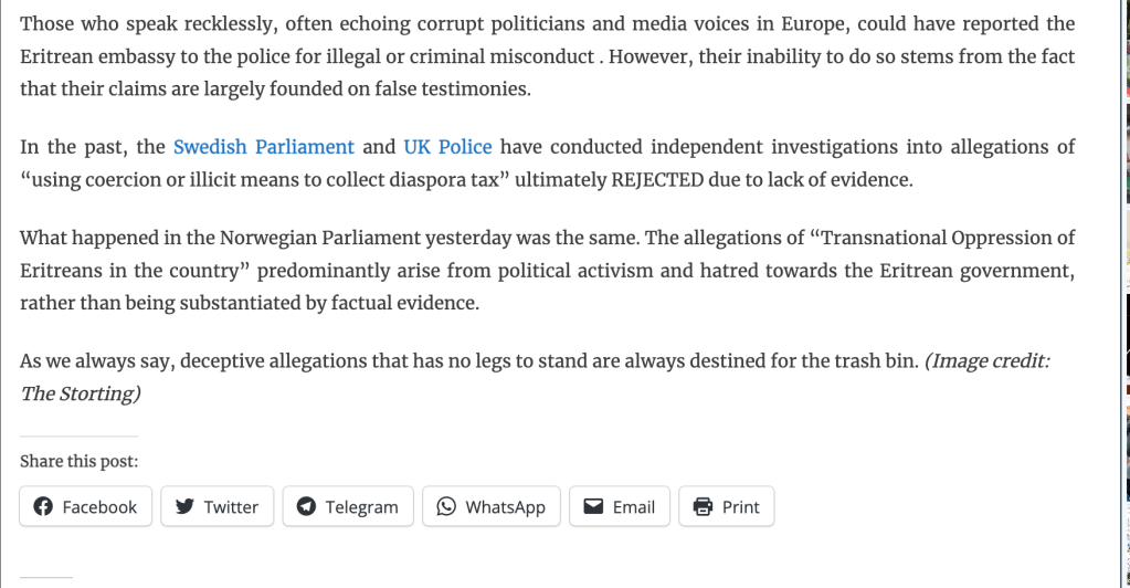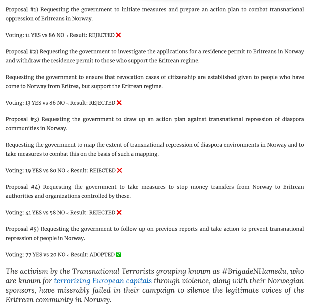 Tesfanews has posted a news item which is simply wrong. Tesfanews claims that the Norwegian Parliament (or Storting) refused to adopt measures to halt Transnational Repression against Eritreans living in Norway by the Eritrean authorities. The exact opposite is the truth.