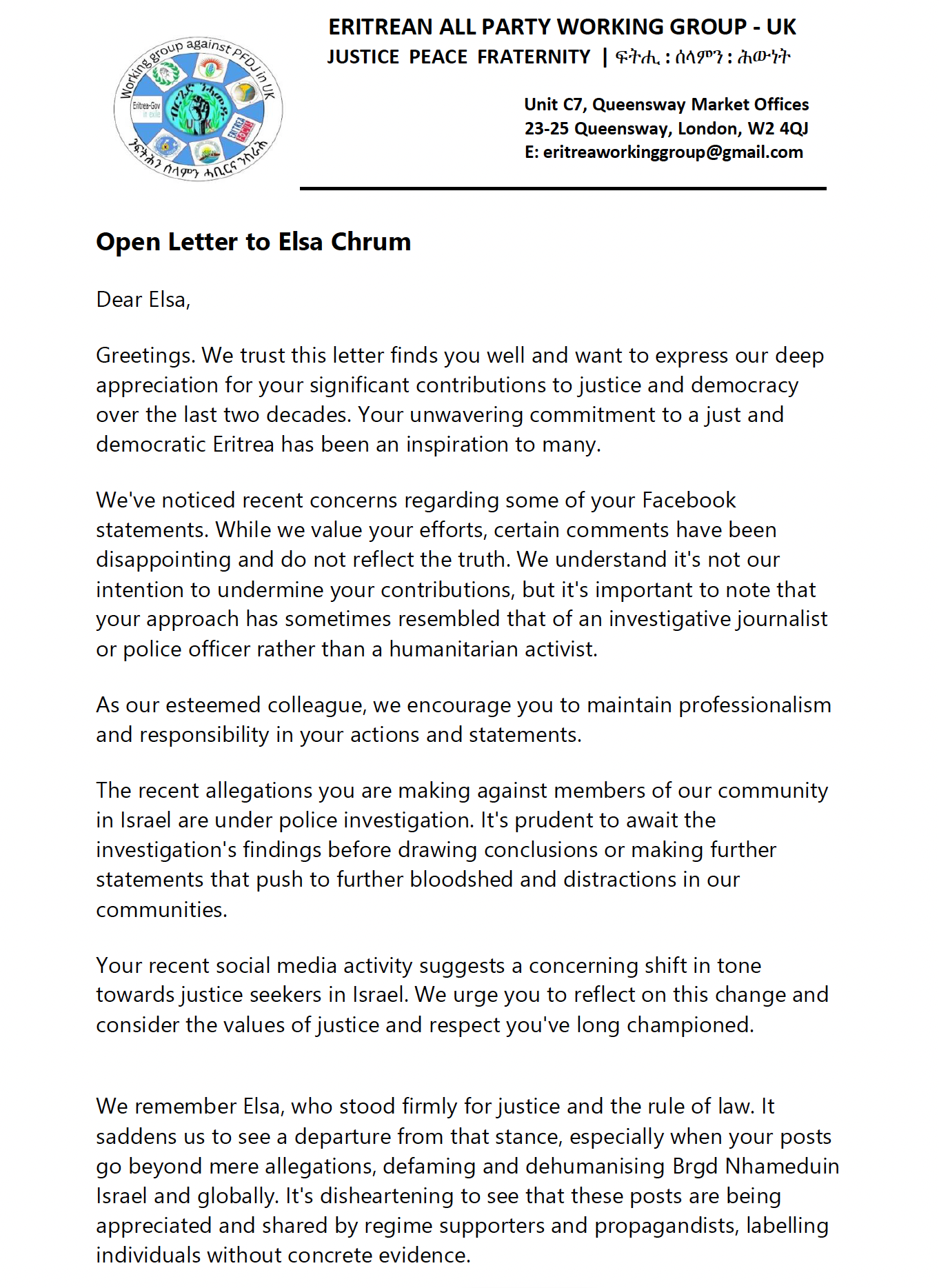 Thanks for giving her a constructive letter. I want to add some ideas because Elsa keeps deleting people’s comments on her page that’s one sign of her wrong and biased information. In the situation in Israel, we all have a connection and knowledge of what happening we condemn the bloodshed between the brothers. But one thing I want to clarify the situation started in 2009/2010 from the refugee camp Shegereab those people called themselves HADE LIBI most of them were smugglers and traffickers during this time they brought people from Eritrea to Sudan and then Israel they did a lot of crime during their journey they have rapist and they have some who killed innocent refugees as well. Those people who committed all these crimes came to Israel they started to live with those who came from the country because of the Eritrean government administration. Simply those people who came to Israel to work and live freely and the others they came to smuggle and traffic, Later on, those smugglers called themselves a name and took the side of the EPLF most of them they are jobless and hopeless. Those are the ones who killed innocent and responsible people. Look who is YIBRAH he was in the Sawa military camp, a Father of Four, a Musicial a footballer responsible person relative to those who killed him three of them are hopeless people Anyone who is interested can figure it out by himself So Elsa tries to accuse that birged named why whats their benefit to kill from those smugglers?