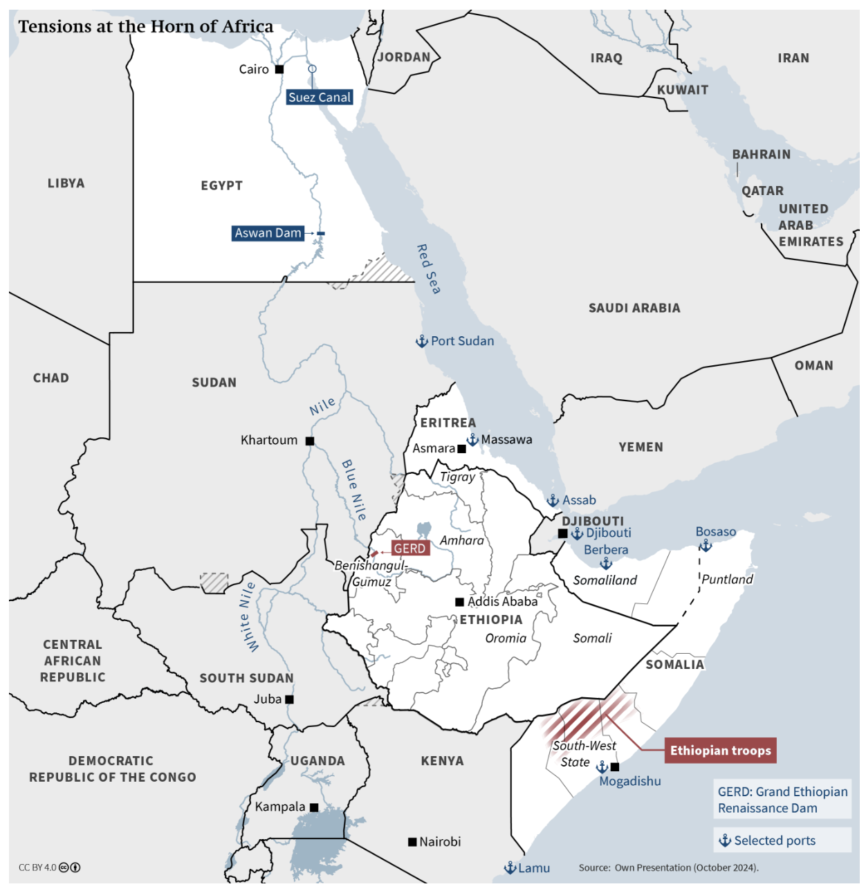 The immediate trigger for the current tensions is the supply of weapons from Egypt to Somalia as a result of a security agreement signed by the two countries in August 2024. In addition, there were reports that Egypt, with agreement from Somalia, is planning to send several thousand soldiers to the Horn of Africa to fight Al-Shabaab and replace the Ethiopian troops that have been stationed there thus far as part of the African Union (AU) mission, which expires at the end of this year. In response, Ethiopian Prime Minister Abiy Ahmed warned that his country would “humiliate anyone who dares to threaten us”. Apparently as a deterrent, the Ethiopian military deployed heavy weapons at the border with Somalia.