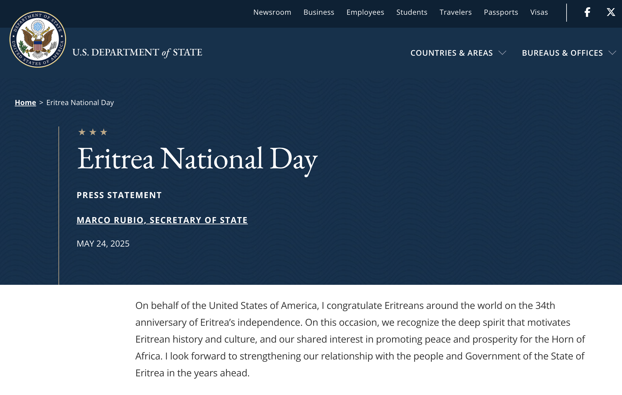 Third, a statement from the US Secretary of State, Marco Rubio, publishing a warm statement on Independence Day, in which he looked forward to “…strengthening our relationship with the people and Government of the State of Eritrea in the years ahead.”