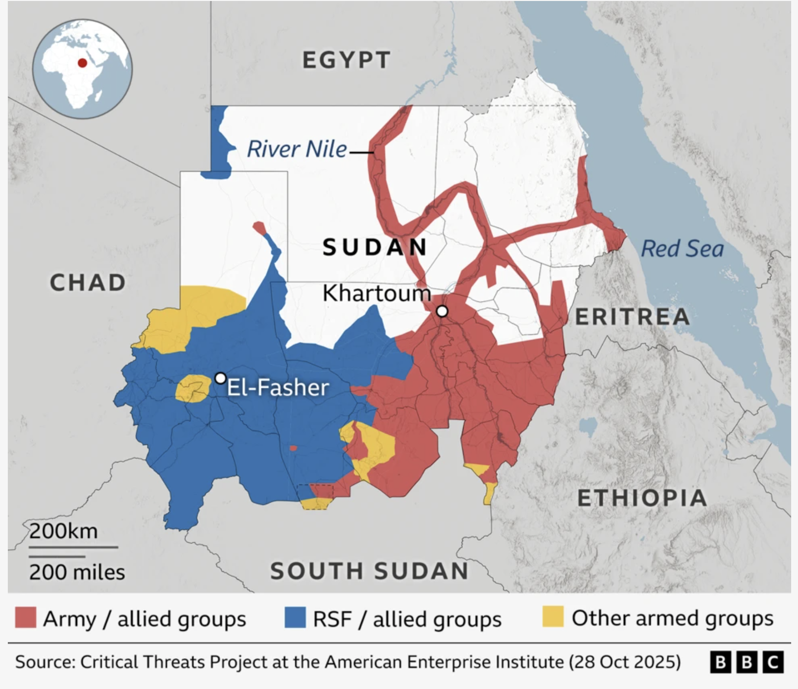 It has left most of western Sudan, bordering on Chad, Libya and the Central African Republic in the hands of Hemedti and the RSF. The centre and much of the east is held by the SAF and al-Burhan.